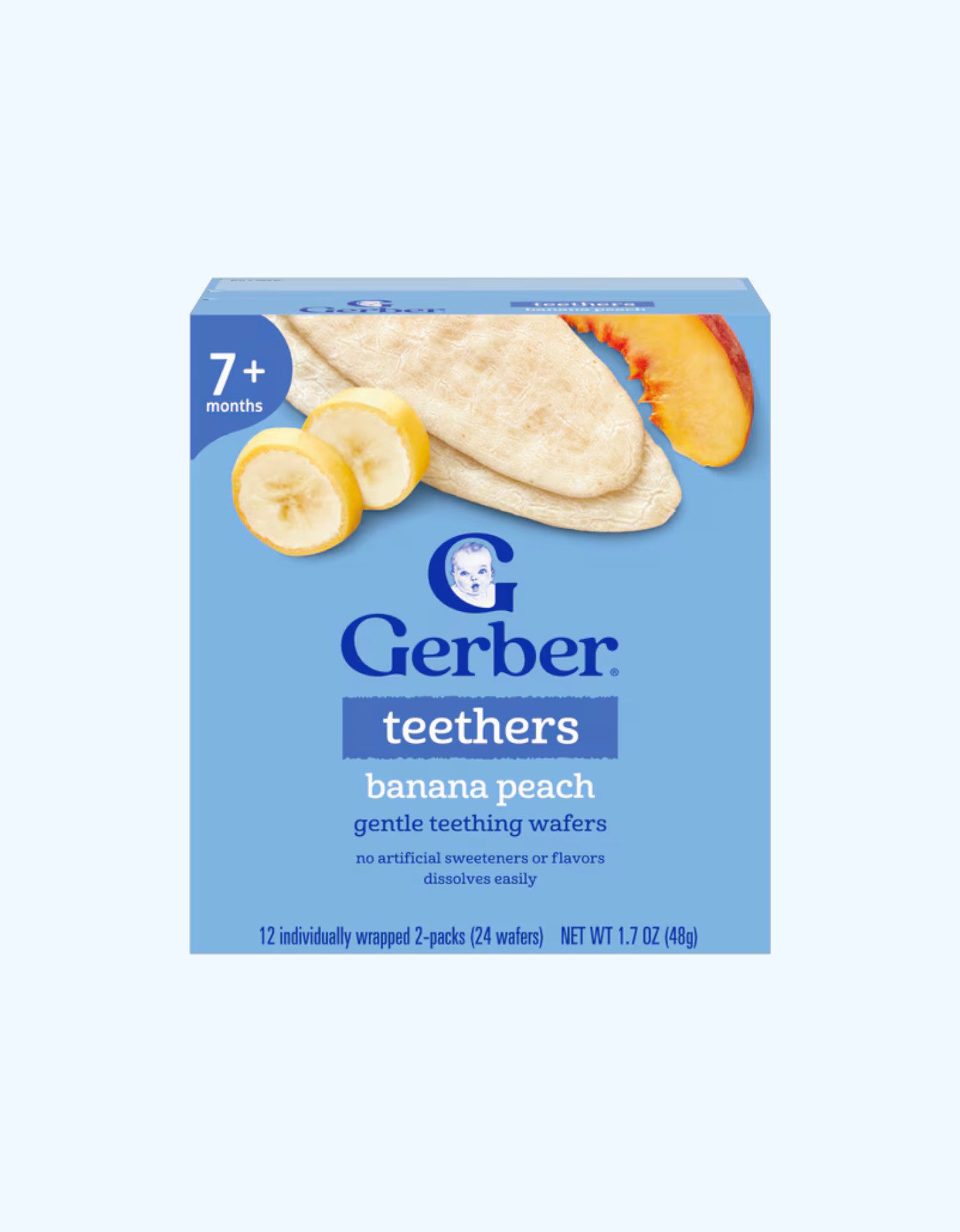 Gerber Teethers - это специальные вафли, разработанные для младенцев старше 7 месяцев, которые находятся в процессе прорезывания зубов. Они имеют мягкую текстуру, которая быстро тает во рту, и содержат вкус банана и персика, чтобы успокоить малыша.