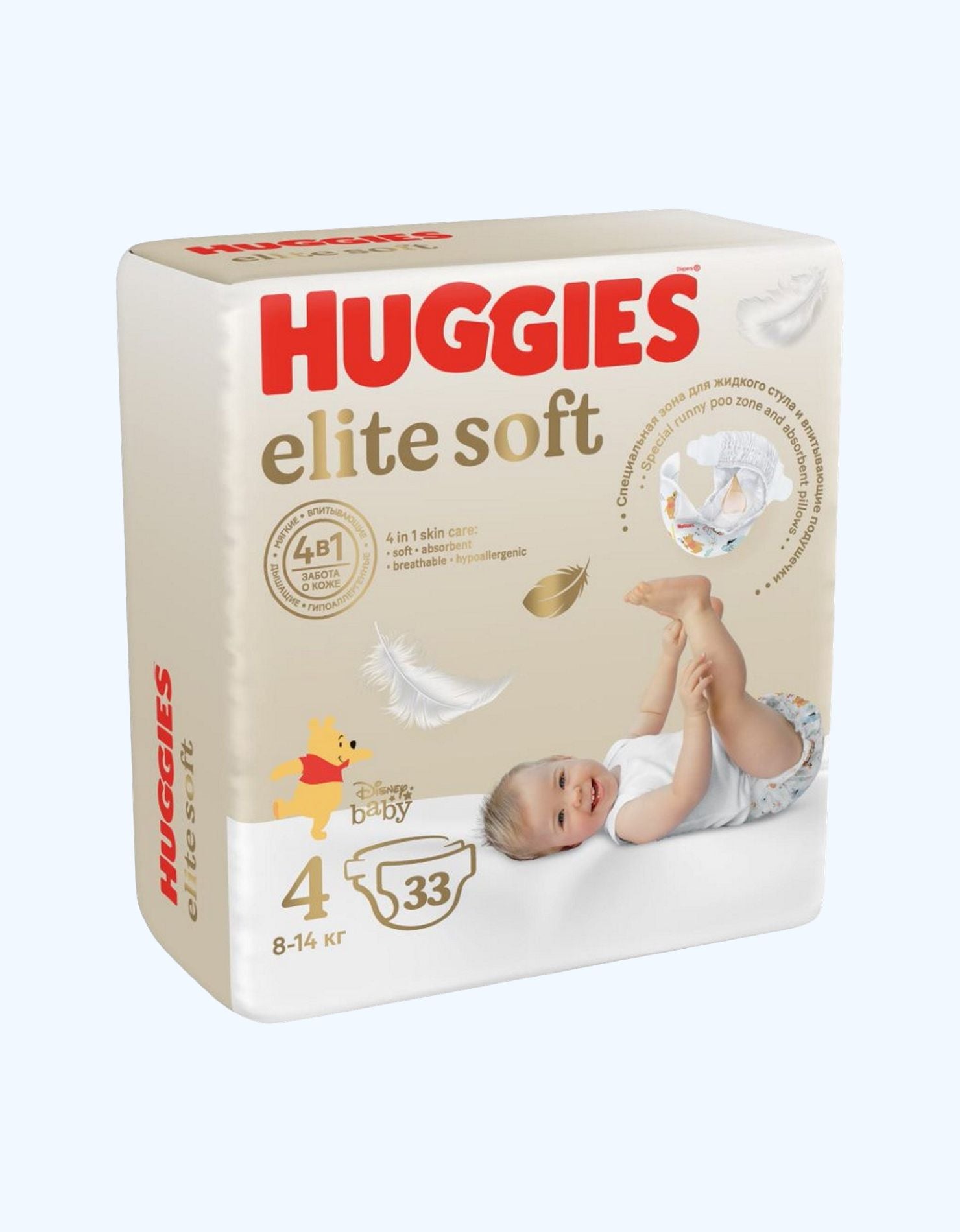 Huggies Elite Soft 4 – это обновленная линейка подгузников, разработанная для обеспечения максимального комфорта и защиты кожи малышей весом от 8 до 14 кг. Улучшенная версия отличается повышенной мягкостью благодаря уникальным впитывающим подушечкам и наличию специальных каналов, которые предотвращают набухание и провисание подгузника. Подгузники прошли дерматологический контроль, гипоаллергенны и подходят как для мальчиков, так и для девочек. Они оснащены индикатором влаги, эластичным пояском и застежками для идеальной посадки, а также внутренним кармашком для предотвращения протеканий. Дизайн украшен персонажами Disney - Винни-Пухом.